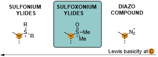 锍葉立德作為兩性離子化合物,一般需要在葉立德Cα-位引入吸電子基來穩(wěn)定其存在。此外,根據(jù)硫原子氧化態(tài)的不同,可以分為sulfonium ylide(正锍葉立德)與sulfoxonium ylide(氧化锍葉立德)兩大類。電負(fù)性氧原子的引入,不僅使得氧化锍葉立德的葉立德碳Lewis堿性降低,而且具Lewis堿性的氧原子或副產(chǎn)物DMSO容易與手性催化劑結(jié)合,從而可能對反應(yīng)過程中的手性誘導(dǎo)產(chǎn)生干擾。但與正锍葉立德以及類似的重氮化合物相比,氧化锍葉立德具有良好的穩(wěn)定性,之前報道的絕大多數(shù)文獻(xiàn)都將其作為重氮化合物的替代物經(jīng)金屬卡賓中間體應(yīng)用于有機合成。因此,發(fā)展基于锍葉立德不對稱催化研究具有重要意義。