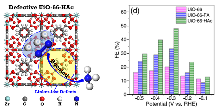 電化學氮還原合成氨(NRR)是最有可能替代傳統(tǒng)Haber-Bosch工藝的綠色合成氨技術(shù)。然而,目前該技術(shù)的法拉第效率絕大部分沒有超過20%,離實際應用的要求還有很大的距離。銀鳳翔-陳標華團隊的何小波副研究員等人在多年研究金屬有機骨架材料基礎上,采用缺陷工程策略合成了具有缺陷的UiO-66-HAc和UiO-66-FA,使電化學合成氨的法拉第效率提升到48%。并且研究發(fā)現(xiàn),合成的催化劑具有配體缺失型缺陷,這種缺陷越多,暴露的Zr6節(jié)點就越多,活性中心就越多,從而增加了電化學活性表面積。同時,這類缺陷還能夠提高NRR過程中催化劑對N2分子及相關(guān)中間體的吸附強度,擴大比表面積與孔體積從而增加N2吸附量。這項工作得到了國家自然科學基金,江蘇省綠色催化材料與技術(shù)重點實驗室以及江蘇省先進催化與綠色制造協(xié)同創(chuàng)新中心等的大力支持,并于近日發(fā)表于電化學領域國際著名期刊Electrochimica Acta (2022, 409, 139988)。