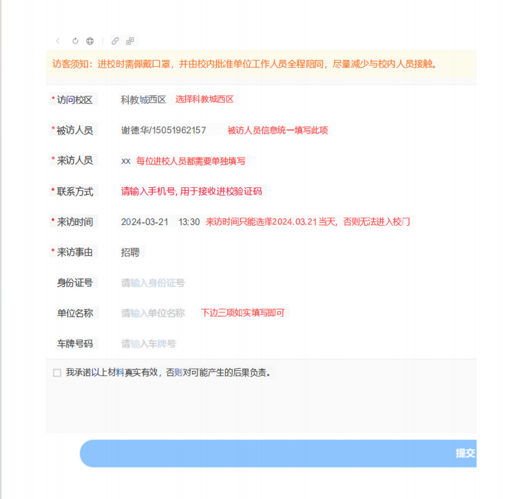 ③信息填寫完畢后點(diǎn)擊提交,審核通過后將收到預(yù)約信息登記成功短信并附帶入校鏈接,入校時請點(diǎn)擊鏈接生成入校二維碼并向門衛(wèi)出示即可。