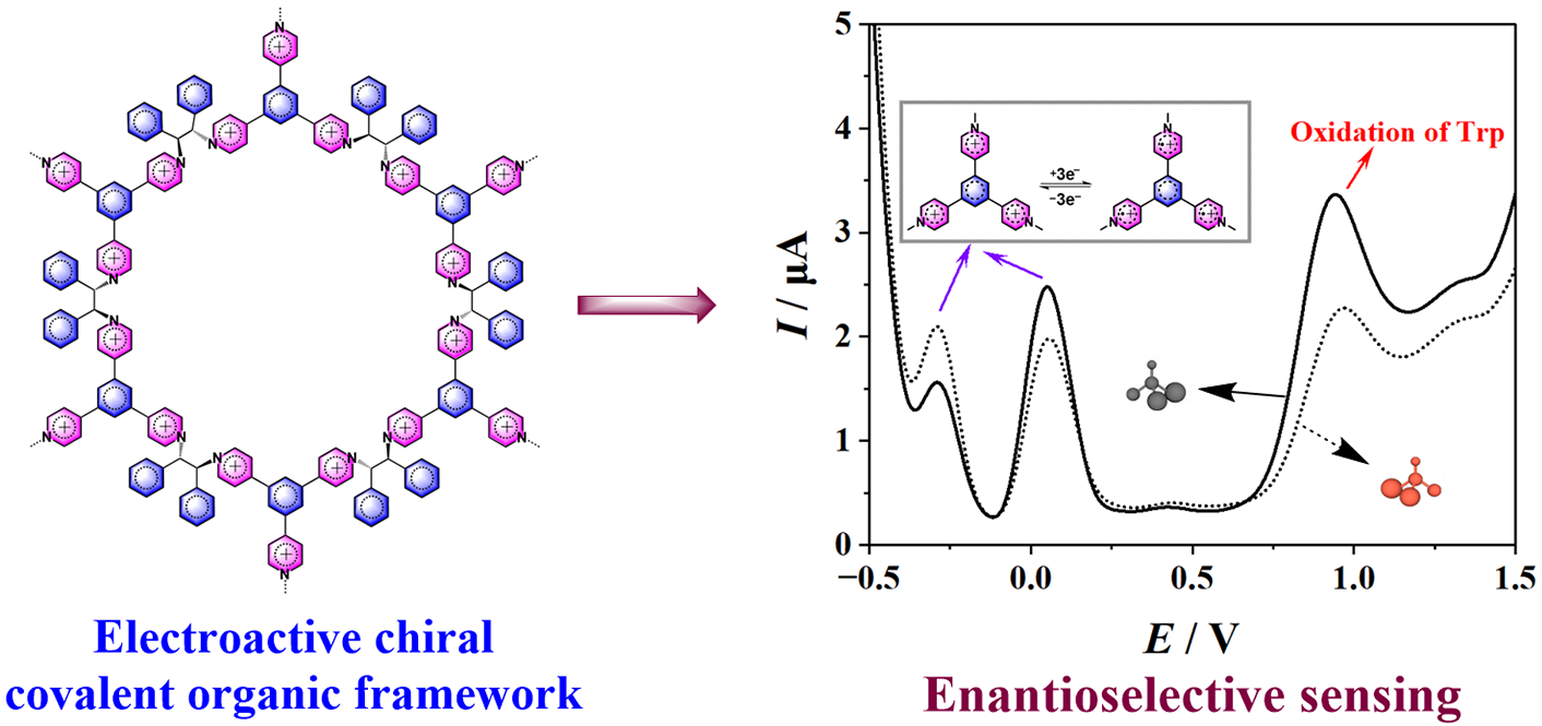 利用吡啶鎓離子有一定電化學(xué)響應(yīng)的特點,該研究小組嘗試制備了具有電化學(xué)活性的手性共價有機框架材料實現(xiàn)對氨基酸和氨基醇分子的手性識別(Anal. Chem.2024, 96, 3200?3207)。此外,該研究小組也報道了一系列二茂鐵基參與的基于靜電吸引和π-π+作用的手性傳感器(Anal. Chem.2020, 92, 13711?13717;Anal. Chem.2021, 93, 10160?10166;Anal. Chem.2022, 94, 6050?6056)。