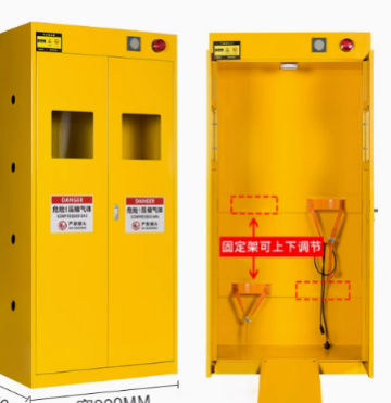 1、柜體材質(zhì):1.2mm厚冷軋鋼板,環(huán)氧樹脂粉末靜電噴涂,門板內(nèi)嵌3mm透明玻璃,一體鎖拉手,隱藏式不銹鋼承重合頁, 配鋼瓶防倒鋼鏈,底部帶鋼搬運斜坡。