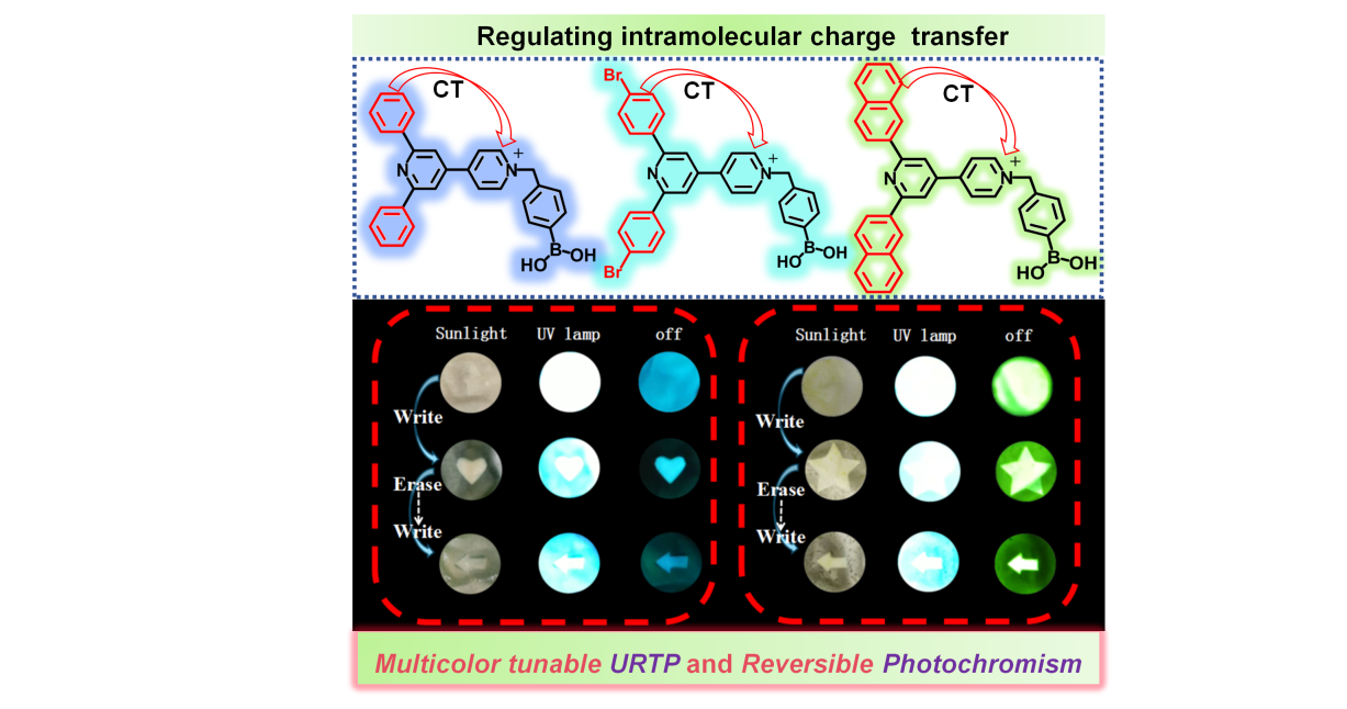 動(dòng)態(tài)光致變色長(zhǎng)壽命室溫磷光材料是一類兼具結(jié)構(gòu)色變化與發(fā)光特性可調(diào)(強(qiáng)度、壽命及顏色)的智能光學(xué)材料,在高級(jí)防偽、信息加密、傳感等領(lǐng)域具有巨大應(yīng)用潛能。然而,如何將光致變色和長(zhǎng)壽命室溫磷光功能有效整合到單一聚合物體系,以構(gòu)筑出多色可調(diào)的高性能的動(dòng)態(tài)光致變色長(zhǎng)壽命室溫磷光聚合物,仍面臨巨大挑戰(zhàn)。我們研究團(tuán)隊(duì)策略性地將具有可調(diào)控分子內(nèi)電荷轉(zhuǎn)移(ICT)能力的非線性吡啶鎓單元嵌入剛性聚乙烯醇(PVA)基質(zhì)中,成功地開(kāi)發(fā)了多色可調(diào)的動(dòng)態(tài)光致變色長(zhǎng)壽命室溫磷光聚合物。