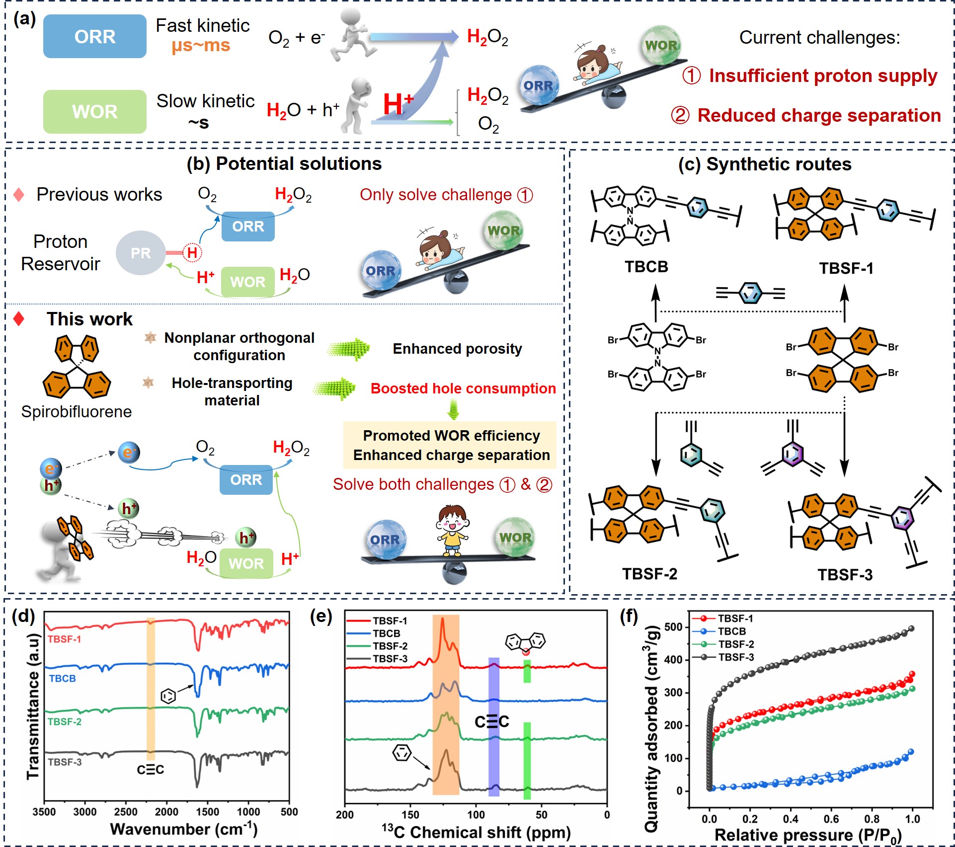 (2)針對質(zhì)子供應(yīng)有限的問題,我們在之前的工作中(Chem, Sci.2025, 16, 8577-8587)提出“質(zhì)子海綿”的概念,直接給氧還原反應(yīng)(ORR)供質(zhì)子,來解決“質(zhì)子悖論”問題。但該策略并未有效抑制光生載流子的復(fù)合和提高電荷傳輸能力。為此,我們提出直接提高水氧化反應(yīng)(WOR)性能的策略,以螺二芴分子為構(gòu)筑單元合成COPs催化劑(圖2)。螺二芴具有正交的空間構(gòu)型,是高效的空穴傳輸材料,基于其的COPs具有諸多優(yōu)點,例如WOR性能大幅度提高以產(chǎn)生更多質(zhì)子,滿足ORR較快的動力學(xué)需求;加速空穴消耗,抑制載流子復(fù)合;獨特的正交電荷傳輸通道更是加速了電荷的傳輸。因此,這類COPs催化劑在純水和空氣中的產(chǎn)H2O2速率達到9.29 mmol g-1 h-1,在氮氣氛圍中也能達到3.28 mmol g-1 h-1。該工作以Orthogonal Configurative Spirobifluorene-Based Conjugated Organic Polymers for Enhanced Water Oxidation Reaction to Boost H2O2 Photosynthesis為題,發(fā)表在材料學(xué)領(lǐng)域頂級期刊Adv. Funct. Mater.2025, e18050。